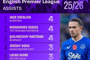 本赛季英超助攻榜:格拉利什、库杜斯、哈特曼4次并列居首