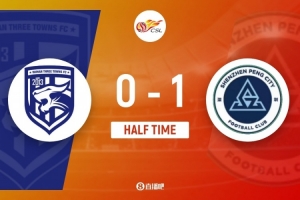 伤停补时5分钟。上半场比赛结束,武汉三镇0-1深圳新鹏城。